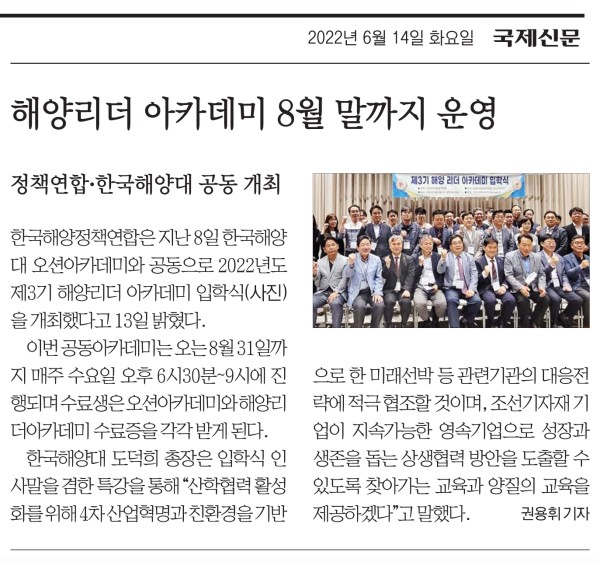 2022년도 제3기 해양리더아카데미 개최 페이지 정보 작성자kcomp 작성일2022-06-23 조회수4,773 본문 2022년 6월 8일 2022년도 제3기 해양리더아카데미 개최 이전글제1회 전국고등학생 코마린 토론대회 개최 안내(해정연에서 동상 4개팀 상금 지원) 다음글2022년도 제1차 운영위원회 개최 목록 댓글 댓글 등록된 댓글이 없습니다.