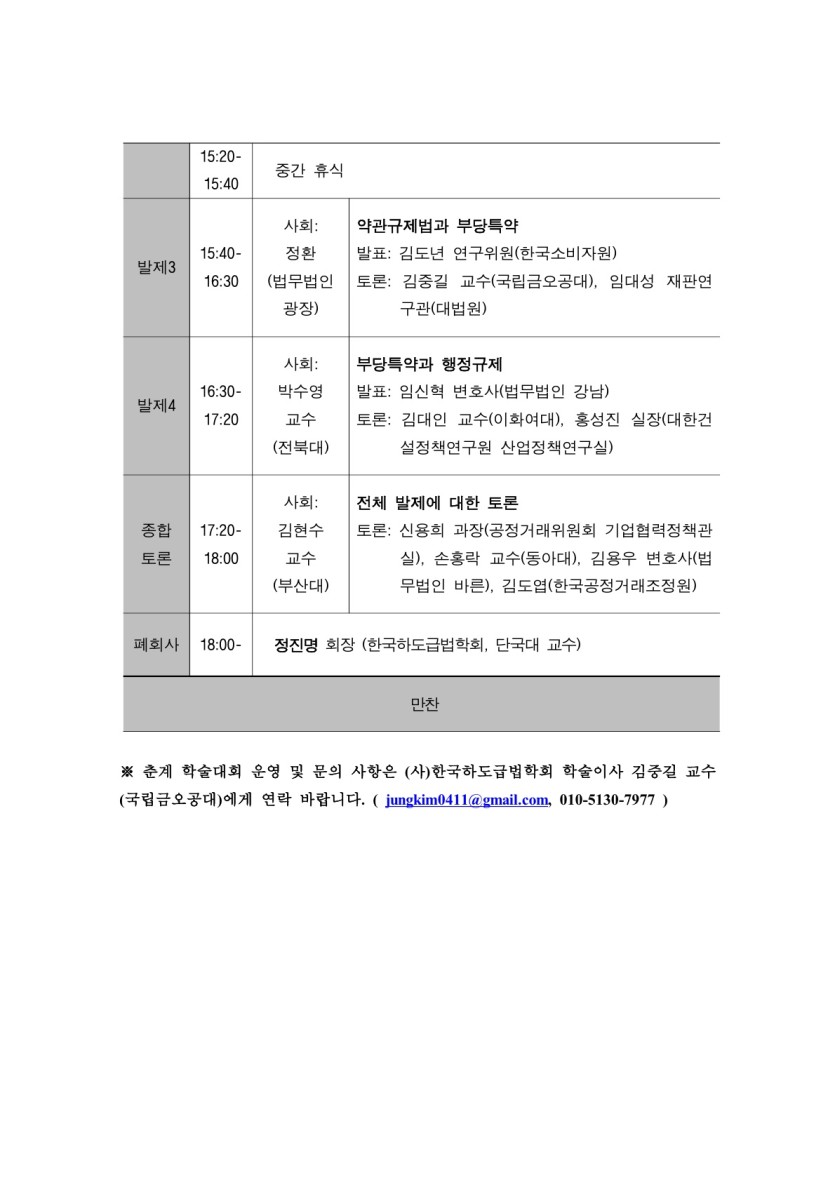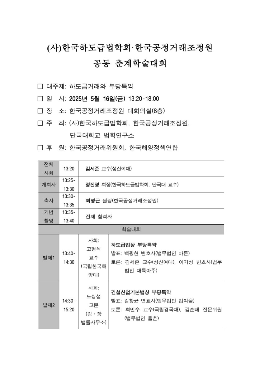 한국하도급법학회. 한국공정거래조정원 공동 춘계학술대회 개최 안내